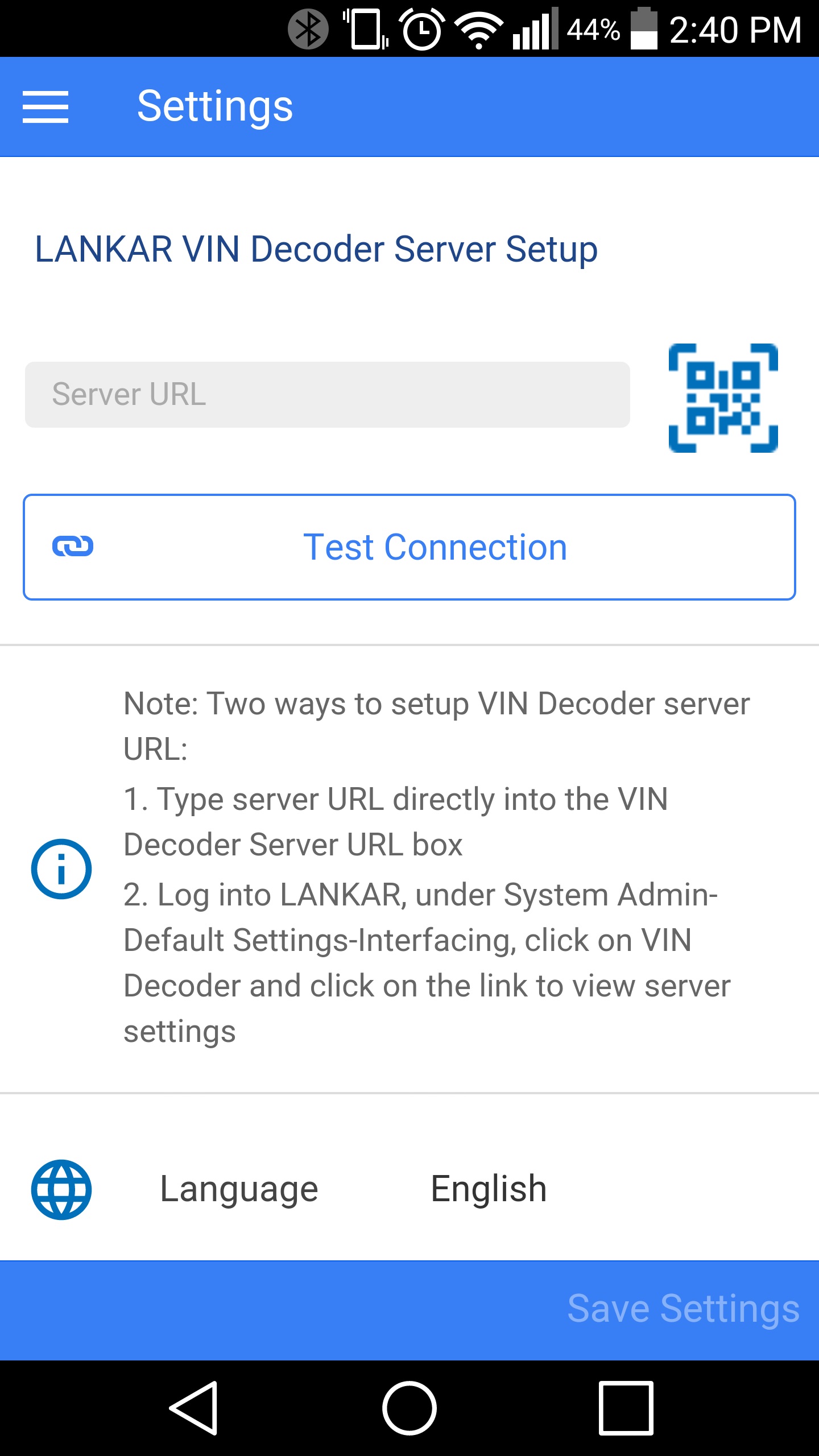 Launching LANKAR VIN Decoder for the first time will bring you to the settings screen. see image